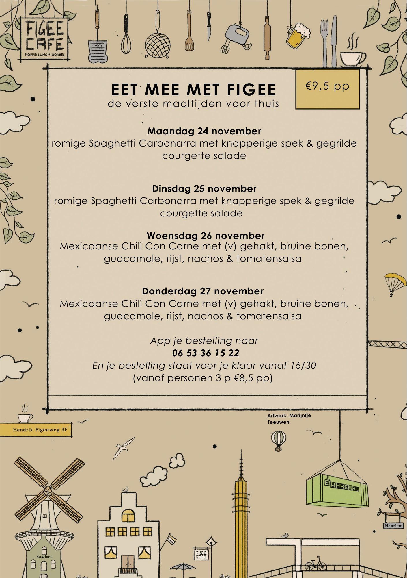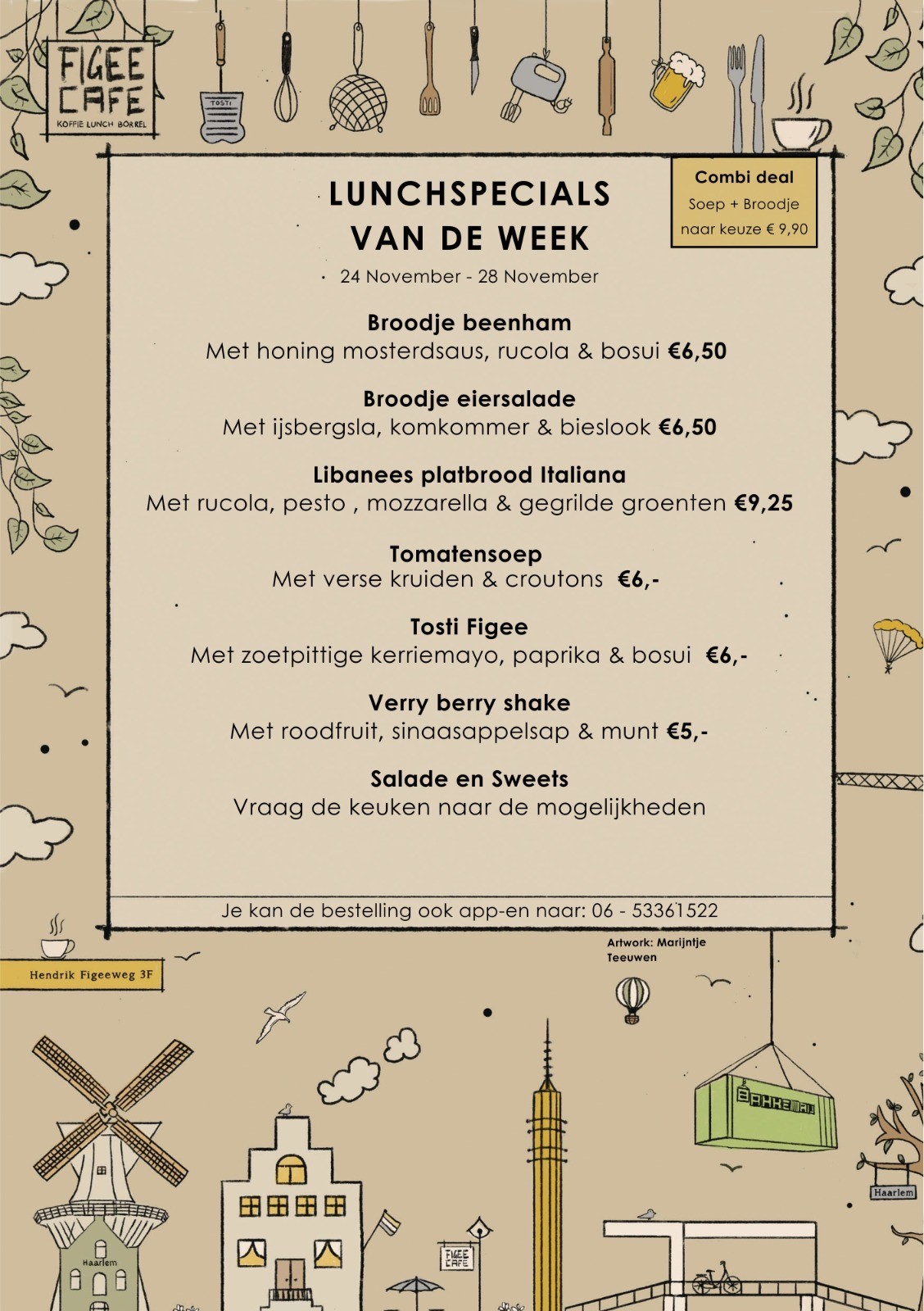 Het Figee Café bevindt zich in een loods: bedrijfsverzamelgebouw De BakkeRij. Alles dat op het menu staat kan je ook meenemen (En lunches voor groepen bezorgen we ook). Ook verzorgen we dagelijks lunch voor bedrijven en bieden we verrassende arrangementen voor vergaderingen of grotere groepen. Het mag natuurlijk nooit gaan vervelen. Daarom hebben we iedere week een heel menu aan nieuwe opties. Zie onderstaand het menu van deze week.