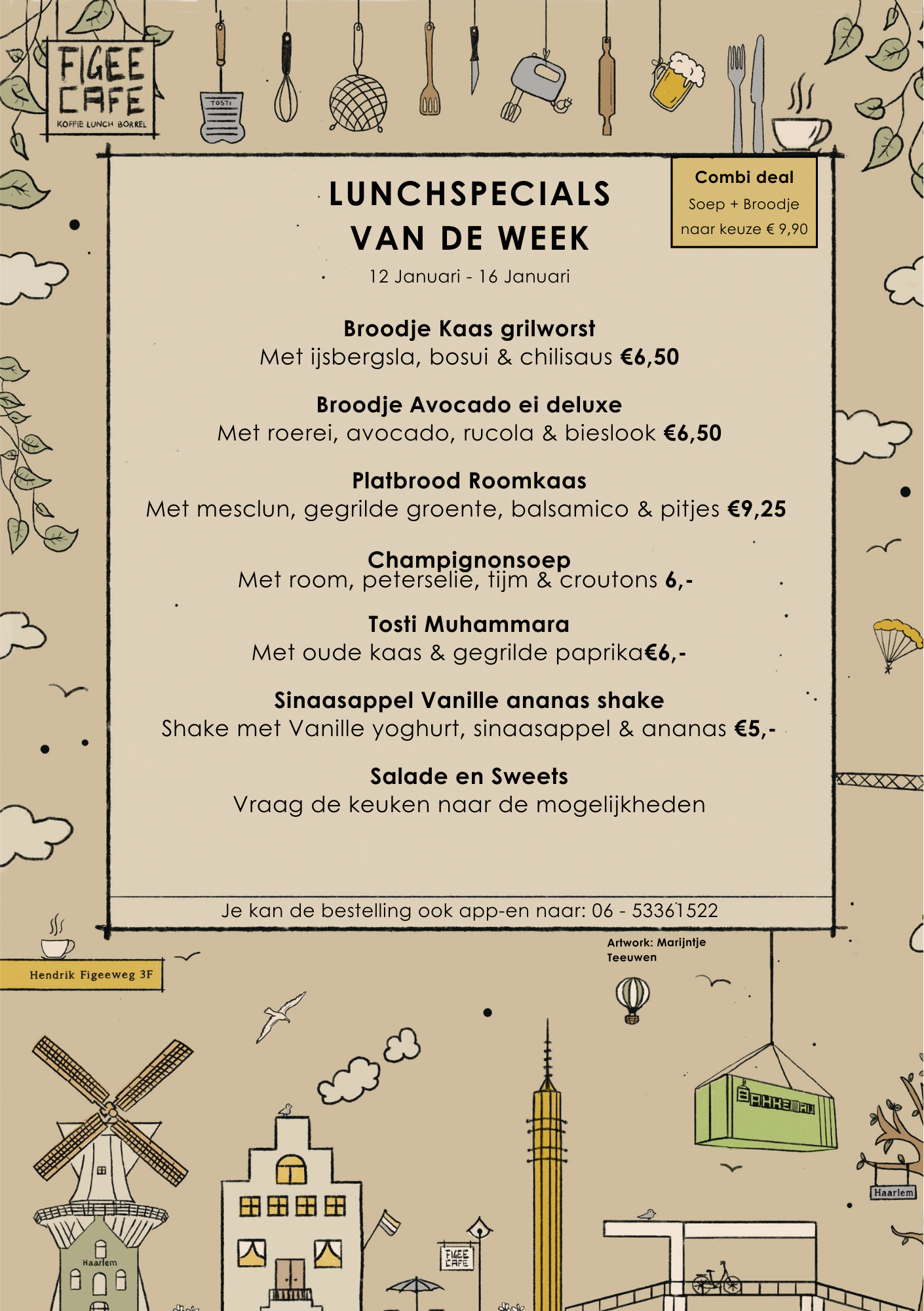 Het Figee Café bevindt zich in een loods: bedrijfsverzamelgebouw De BakkeRij. Alles dat op het menu staat kan je ook meenemen (En lunches voor groepen bezorgen we ook). Ook verzorgen we dagelijks lunch voor bedrijven en bieden we verrassende arrangementen voor vergaderingen of grotere groepen. Het mag natuurlijk nooit gaan vervelen. Daarom hebben we iedere week een heel menu aan nieuwe opties. Zie onderstaand het menu van deze week.